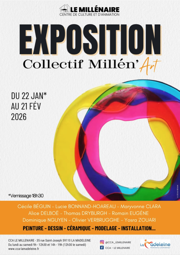 Maryvonne participe à l'Exposition "Collectif Millén'art "- Centre de Culture et d'animation "le Millénaire" - La Madeleine - Du 22 janvier au 21 février 2026 voir l'affiche